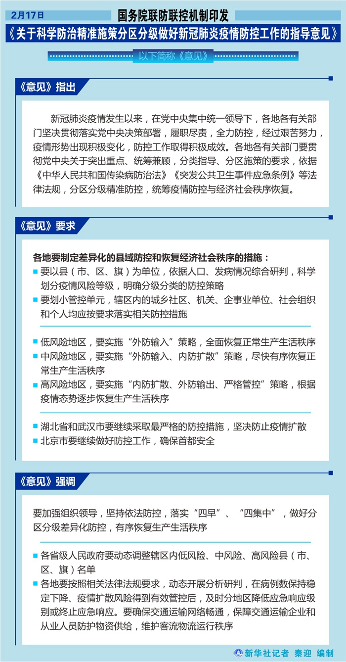 新華社北京2月18日電? 2月17日,國務(wù)院聯(lián)防聯(lián)控機(jī)制印發(fā)《關(guān)于科學(xué)防治精準(zhǔn)施策分區(qū)分級做好新冠肺炎疫情防控工作的指導(dǎo)意見》(以下簡稱《意見》)。
