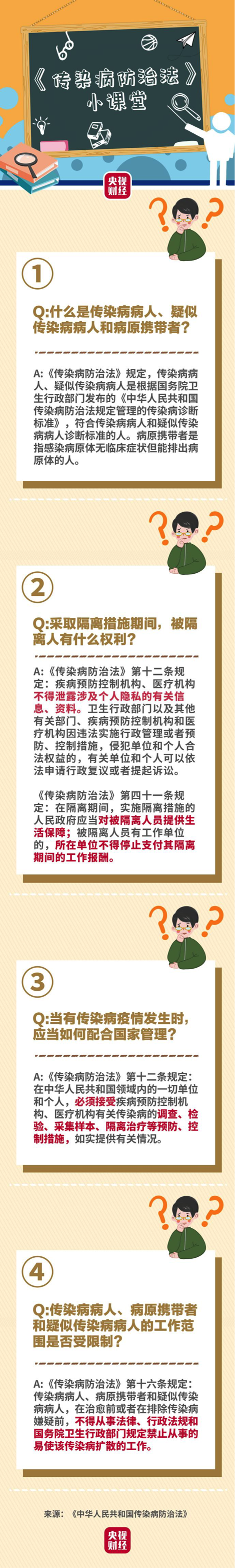 隔離期間不工作,你還能拿到工資嗎?配合疾病預(yù)防控制機構(gòu)、醫(yī)療機構(gòu)調(diào)查,你的個人信息會被泄露嗎?在治愈前或者在排除傳染病嫌疑前,你的工作范圍受限嗎?新冠肺炎疫情當(dāng)下,我們該如何用法律保護自己?央視財經(jīng)今天推出《傳染病防治法》小課堂第二期,戳一圖↓↓