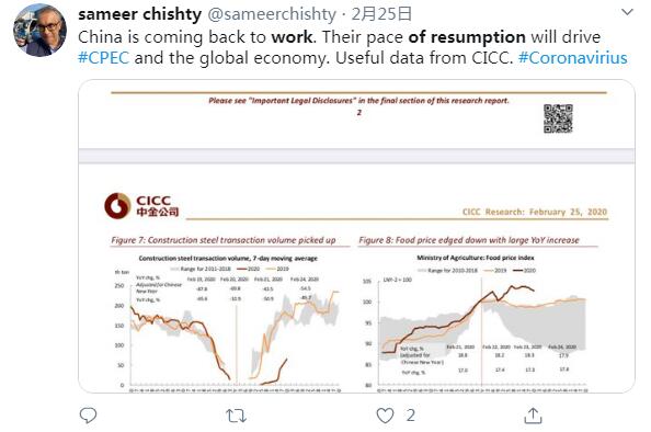 推特用戶sameer chishty說:中國正在復工復產。他們的這一步伐將驅動全球經濟增長。