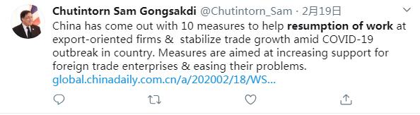 推特用戶Chutintorn Sam Gongsakdi說:在應對新冠肺炎疫情期間,中國出臺了10項措施來幫助出口企業(yè)復工復產,并推動貿易的穩(wěn)定增長。這些措施旨在加強對外貿企業(yè)的支持,并解決它們面臨的問題。