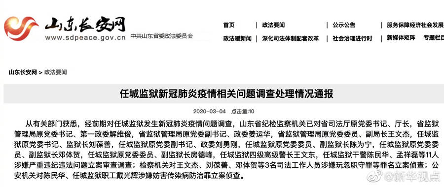 從有關(guān)部門獲悉,經(jīng)前期對任城監(jiān)獄發(fā)生新冠肺炎疫情問題調(diào)查,山東省紀(jì)檢監(jiān)察機(jī)關(guān)已對省司法廳原黨委書記、廳長,省監(jiān)獄管理局原黨委書記、第一政委解維俊,省監(jiān)獄管理局原黨委副書記、政委姜運華,省監(jiān)獄管理局原黨委委員、副局長王文杰,任城監(jiān)獄原黨委書記、監(jiān)獄長劉葆善,任城監(jiān)獄原黨委副書記、政委劉勇剛,任城監(jiān)獄原黨委委員、副監(jiān)獄長陳為寧,任城監(jiān)獄原黨委委員、副監(jiān)獄長鄧體賀,任城監(jiān)獄原黨委委員、副監(jiān)獄長房德峰,任城監(jiān)獄四級高級警長王文東,任城監(jiān)獄干警陳民華、孟祥磊等11人涉嫌嚴(yán)重違紀(jì)違法問題立案審查調(diào)查;檢察機(jī)關(guān)對王文杰、劉葆善、鄧體賀等3名司法工作人員涉嫌玩忽職守罪等罪名立案偵查;公安機(jī)關(guān)對陳民華、任城監(jiān)獄職工戴光輝涉嫌妨害傳染病防治罪立案偵查。
