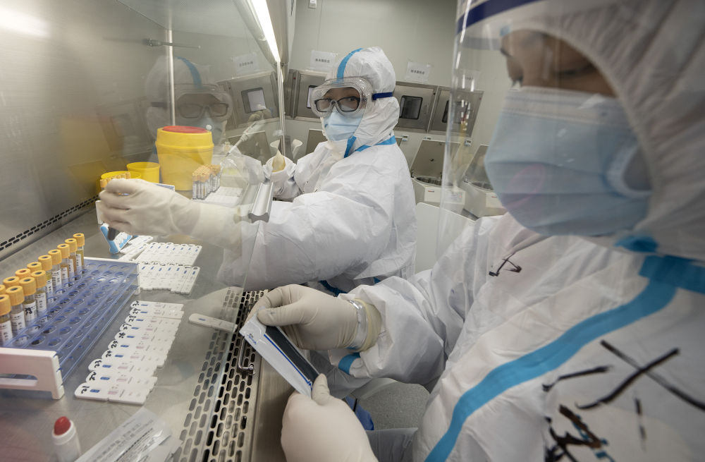 ↑3月4日,在武漢雷神山醫(yī)院醫(yī)學(xué)檢驗科,工作人員在對患者的血液樣本進行檢測。