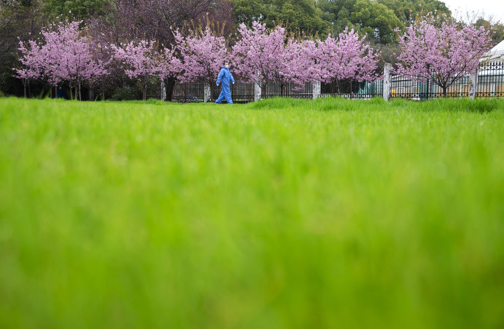 ↑3月3日,一名工作人員從盛開的櫻花樹下走過。由于學(xué)校進行封閉管理,我在這幾顆櫻花樹旁等了一個多小時,只遇到了兩個人。