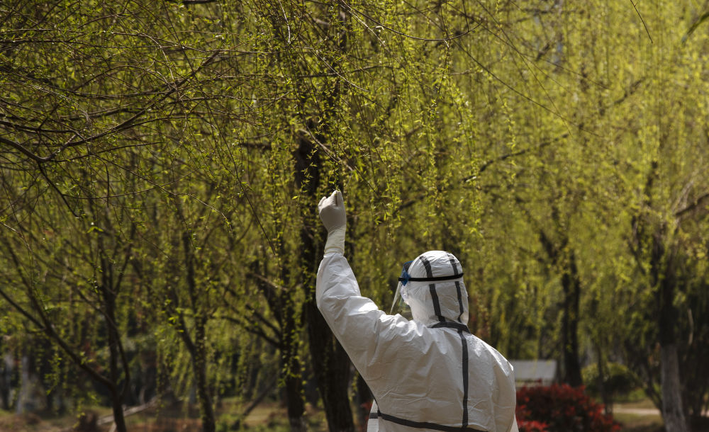 ↑3月14日,在華中科技大學(xué)同濟醫(yī)學(xué)院附屬同濟醫(yī)院光谷院區(qū),負責(zé)新冠病毒肺炎患者轉(zhuǎn)運的云南醫(yī)療隊隊員姚紅軍伸手觸摸剛剛發(fā)芽的柳枝。