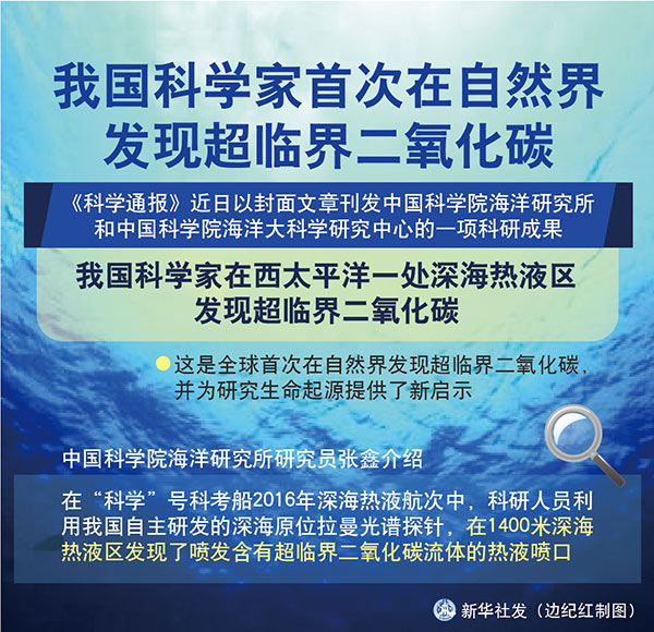 新華社青島5月11日電(記者張旭東)《科學(xué)通報(bào)》近日以封面文章刊發(fā)中國(guó)科學(xué)院海洋研究所和中國(guó)科學(xué)院海洋大科學(xué)研究中心的一項(xiàng)科研成果:我國(guó)科學(xué)家在西太平洋一處深海熱液區(qū)發(fā)現(xiàn)超臨界二氧化碳,這是全球首次在自然界發(fā)現(xiàn)超臨界二氧化碳,并為研究生命起源提供了新啟示。
