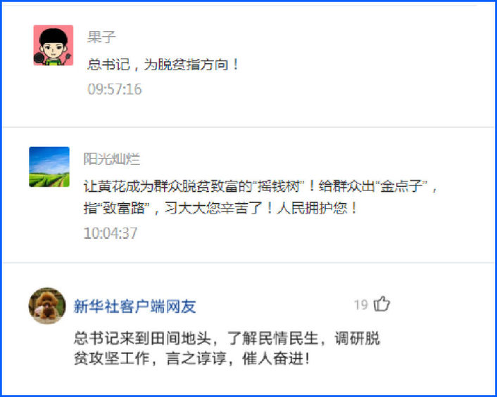 消息播發(fā)后,引起網(wǎng)民熱烈反響。大家紛紛為總書記關(guān)心脫貧攻堅(jiān)、親自指導(dǎo)產(chǎn)業(yè)扶貧叫好,為總書記心系群眾、深入一線點(diǎn)贊。