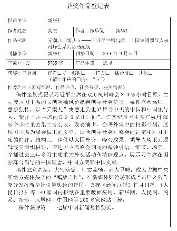 秦杰同志長(zhǎng)期承擔(dān)中央主要領(lǐng)導(dǎo)同志的采訪報(bào)道任務(wù)。無論在條件艱苦的青藏高原,還是在行程萬里日程頻密的高訪之中,他都能不辭辛苦、日夜奮戰(zhàn),以高度的政治責(zé)任感和精益求精的職業(yè)精神出色完成任務(wù)。他參與采寫的《更高舉起改革開放偉大旗幟——寫在鄧小平同志誕辰110周年之際》和牽頭采寫的《弄潮兒向濤頭立——習(xí)近平主席出席二十國集團(tuán)領(lǐng)導(dǎo)人杭州峰會(huì)系列活動(dòng)紀(jì)實(shí)》獲得中國新聞最高獎(jiǎng)——中國新聞獎(jiǎng)特別獎(jiǎng),參與撰寫的《中共高層新陣容》被譽(yù)為中國領(lǐng)導(dǎo)人對(duì)外報(bào)道的開創(chuàng)性作品并獲中國新聞獎(jiǎng)一等獎(jiǎng)。他采寫的《歷史見證承諾》《一枝一葉總關(guān)情》等報(bào)道成為時(shí)政報(bào)道領(lǐng)域不可多得的精品。
