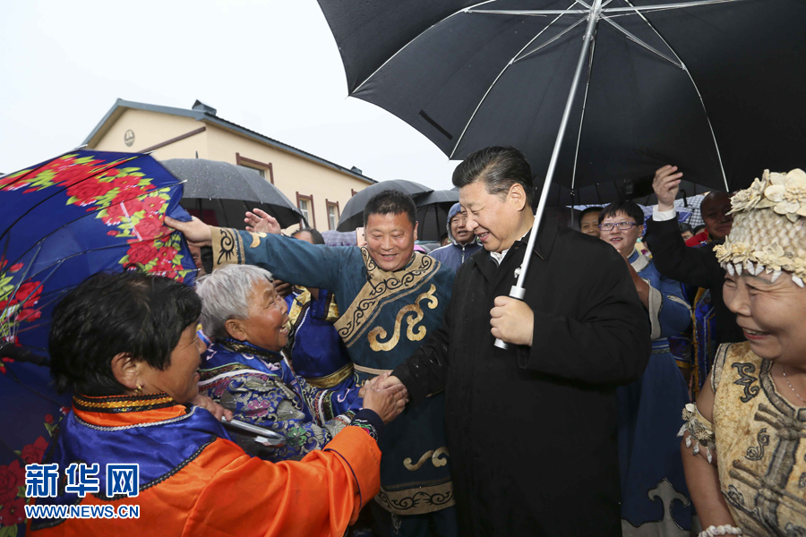 2014年春節(jié)前夕,習(xí)近平來到內(nèi)蒙古,看望慰問各族干部群眾。他來到錫林浩特市寶力根蘇木(鄉(xiāng))冬季那達慕,同牧民們一起觀摔跤,看賽馬,聽長調(diào),賞歌舞。在傳統(tǒng)的“五畜祈?!眱x式上,他按照蒙古族習(xí)俗,用無名指蘸上銀碗盛著的鮮牛奶彈了三下,祝福來年風(fēng)調(diào)雨順,五畜興旺,人民幸福安康。