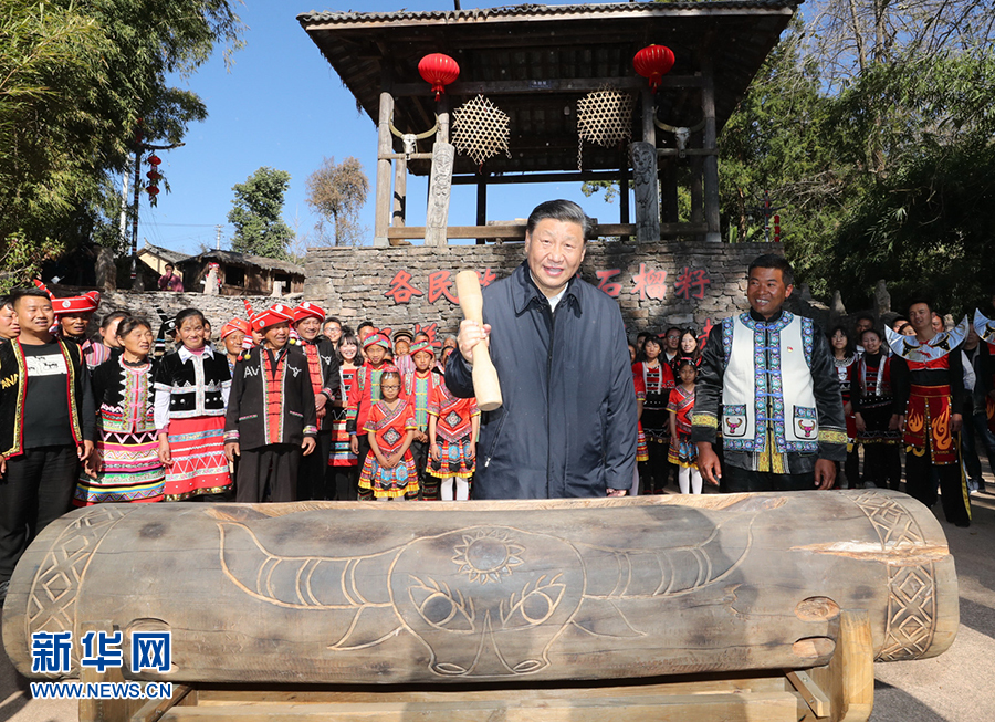今年1月19日,正在云南考察的習(xí)近平來到騰沖市清水鄉(xiāng)三家村中寨司莫拉佤族村。司莫拉,佤語意為“幸福的地方”。習(xí)近平說,在大家努力下,你們這里已經(jīng)實現(xiàn)脫貧并正向新的發(fā)展目標努力邁進,可喜可賀。全面建成小康社會之后要全面推進鄉(xiāng)村振興,讓幸福的佤族村更加幸福!按照當(dāng)?shù)亓?xí)俗,習(xí)近平拿起鼓棒,敲響三聲木鼓,祝福風(fēng)調(diào)雨順、國泰民安、四海升平,并向鄉(xiāng)親們致以新春祝福。