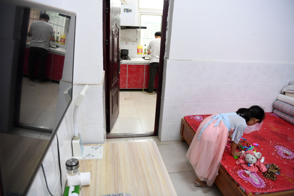 ↑?小思揚(yáng)在宿舍里玩耍,鄭加衛(wèi)在準(zhǔn)備晚飯。