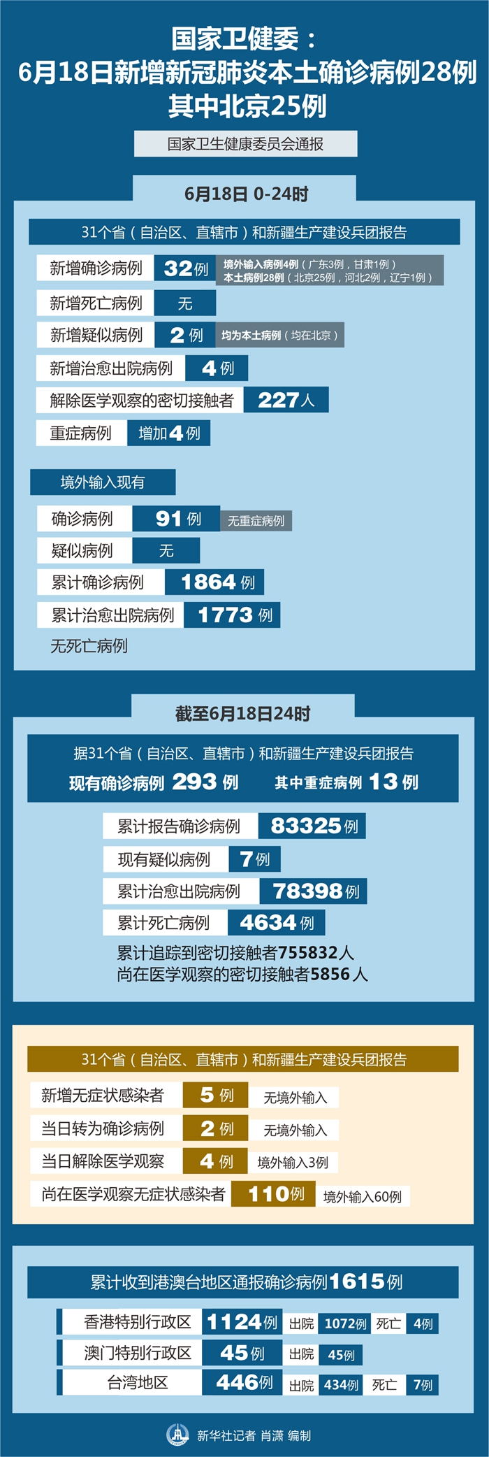 新華社北京6月19日電(記者田曉航)據(jù)國家衛(wèi)生健康委員會19日通報,6月18日0-24時,31個?。ㄗ灾螀^(qū)、直轄市)和新疆生產(chǎn)建設(shè)兵團報告新增新冠肺炎確診病例32例,其中境外輸入病例4例(廣東3例,甘肅1例),本土病例28例(北京25例,河北2例,遼寧1例);無新增死亡病例;新增疑似病例2例,均為本土病例(均在北京)。
