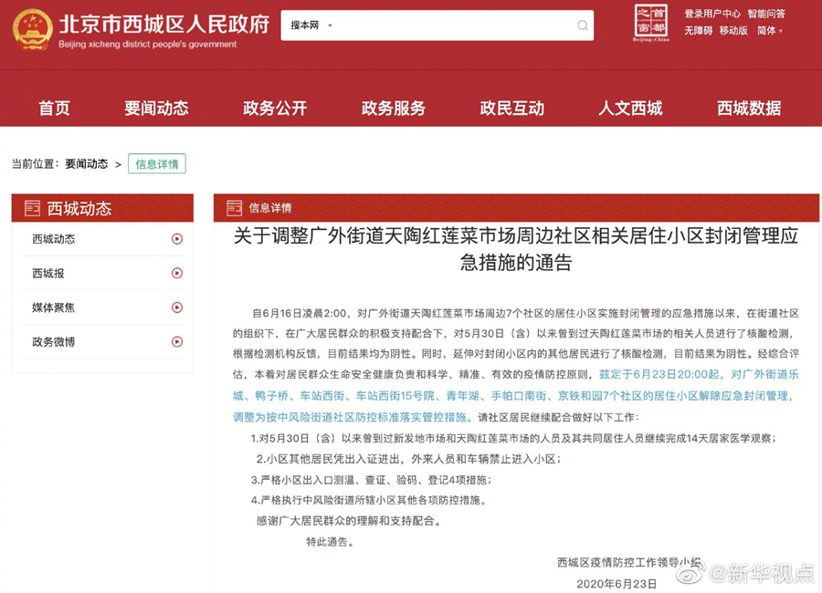 北京市西城區(qū)23日發(fā)布通告:6月23日20:00起,對廣外街道樂城、鴨子橋、車站西街、車站西街15號院、青年湖、手帕口南街、京鐵和園7個(gè)社區(qū)的居住小區(qū)解除應(yīng)急封閉管理,調(diào)整為按中風(fēng)險(xiǎn)街道社區(qū)防控標(biāo)準(zhǔn)落實(shí)管控措施。6月15日,北京市西城區(qū)衛(wèi)生健康委員會官方微博通報(bào)稱,6月14日,廣外天陶紅蓮菜市場有一名往來新發(fā)地市場人員被確診為新冠肺炎病例。(記者烏夢達(dá)、魯暢)