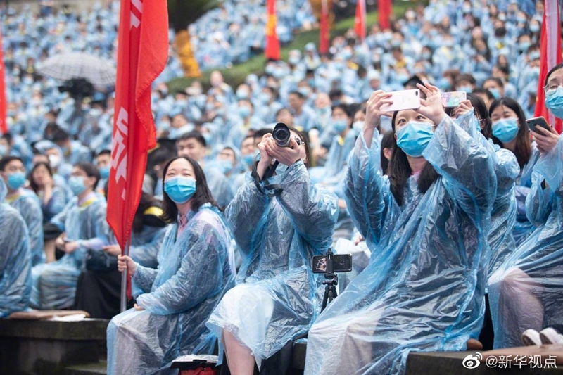 6月28日上午,重慶大學在風雨操場舉行2020屆學生畢業(yè)典禮上,因為現(xiàn)場突然下起了大雨,校長張宗益在致辭時只念了標題,向畢業(yè)生送上深情祝福,還打趣說“好雨知時節(jié)”。參加畢業(yè)典禮的2000余名畢業(yè)生代表穿著雨衣,完成了這場簡短的畢業(yè)典禮。(記者柯高陽)?