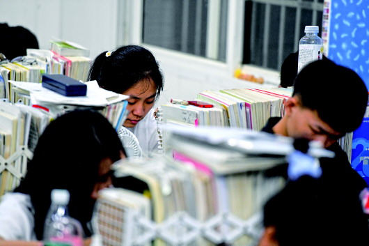 在湖南岳陽平江縣第二中學,向欣儀(中)在教室復習功課,備戰(zhàn)高考(7月3日攝)。記者陳澤國攝