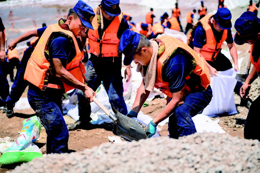 ▲7月23日,在浪拔湖鎮(zhèn)紅堰湖村,救援人員在裝填石袋。新華社記者陳思汗攝