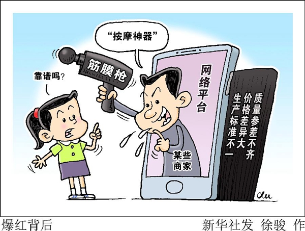 筋膜槍似乎“一夜”出圈成為網(wǎng)紅產(chǎn)品。今年“6.18”網(wǎng)絡(luò)購物平臺活動首日,某品牌筋膜槍開售1小時即突破百萬元銷售額。在某直播平臺,一位網(wǎng)絡(luò)達人首次帶貨就售出5000多件,累計銷售額近500萬元。還有明星在視頻平臺推廣,1萬余件產(chǎn)品幾乎“秒搶”。