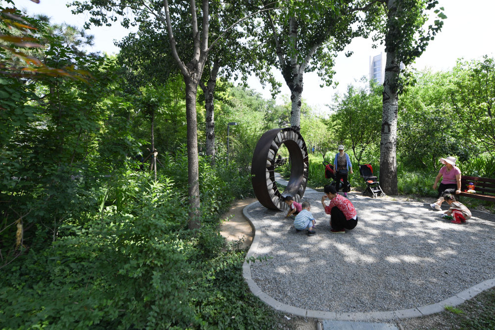 市民在北京市西城區(qū)“廣陽谷”城市森林內(nèi)游玩(6月10日攝)。新華社記者 鞠煥宗 攝