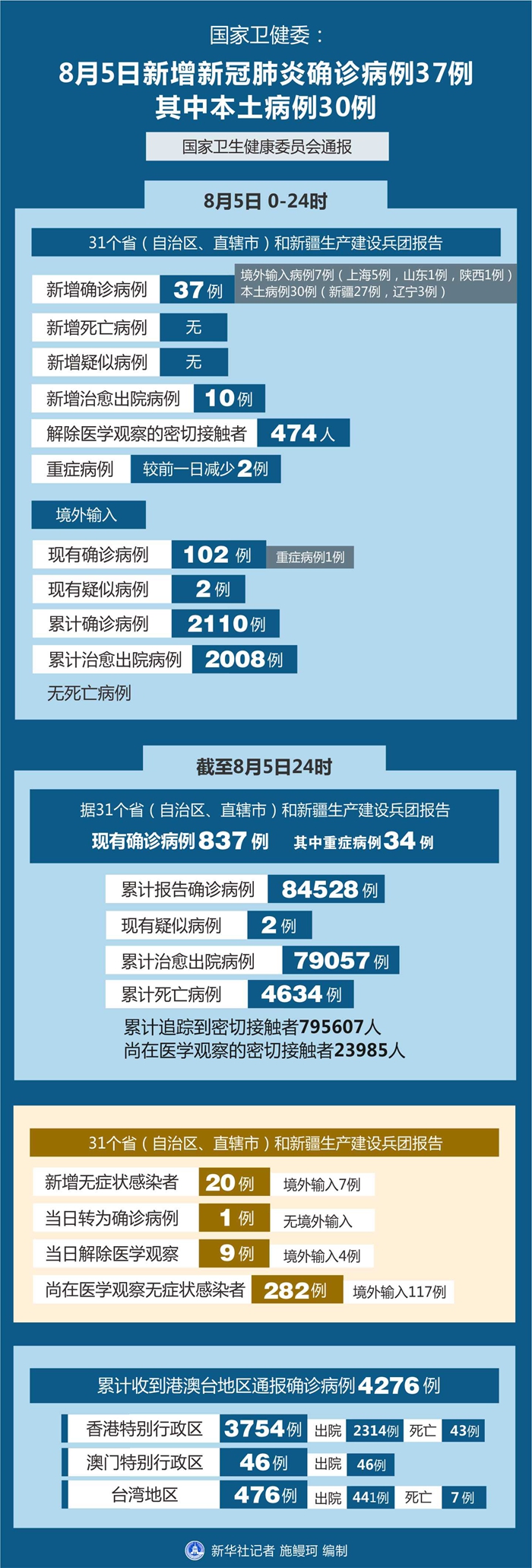 截至8月5日24時,據(jù)31個?。ㄗ灾螀^(qū)、直轄市)和新疆生產(chǎn)建設兵團報告,現(xiàn)有確診病例837例(其中重癥病例34例),累計治愈出院病例79057例,累計死亡病例4634例,累計報告確診病例84528例,現(xiàn)有疑似病例2例。累計追蹤到密切接觸者795607人,尚在醫(yī)學觀察的密切接觸者23985人。