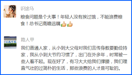 吃飯人人會(huì),但怎么吃卻見境界。早在2013年,總書記在闡述糧食安全戰(zhàn)略時(shí)就告誡人們,“要牢記歷史,在吃飯問題上不能得健忘癥,不能好了傷疤忘了疼”。這次,總書記又強(qiáng)調(diào),“盡管我國(guó)糧食生產(chǎn)連年豐收,對(duì)糧食安全還是始終要有危機(jī)意識(shí)”。對(duì)此,很多網(wǎng)友深表贊同,認(rèn)為這些指示要言不煩、直指要害,我們決不能忘記餓肚子的歲月!