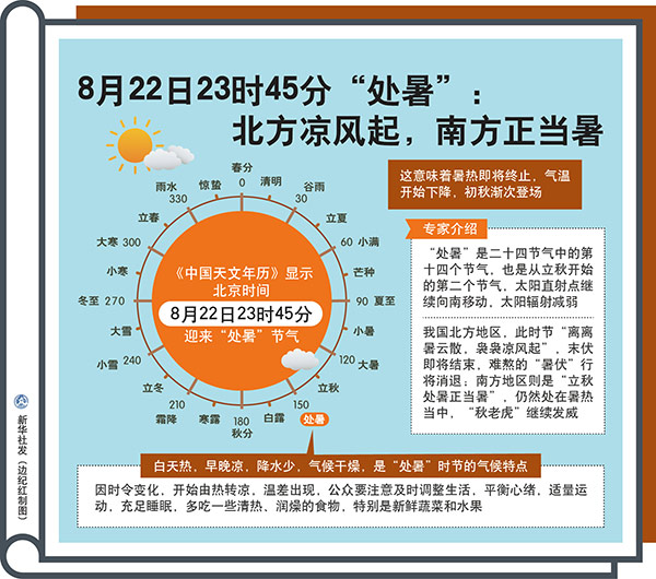 圖表:8月22日23時45分“處暑”:北方?jīng)鲲L(fēng)起,南方正當(dāng)暑 新華社發(fā) 邊紀(jì)紅 制圖