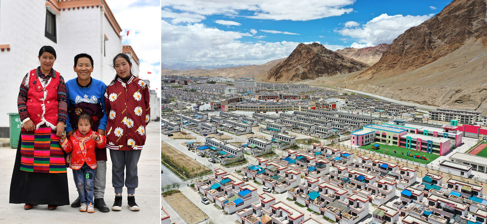 拼版照片:左圖為西藏阿里地區(qū)日土縣東汝鄉(xiāng)阿汝村村民丹木真一家在噶爾縣康樂新居易地扶貧搬遷安置點(diǎn);右圖為該搬遷安置點(diǎn)一角(無人機(jī)照片)。新華社記者 詹彥 攝