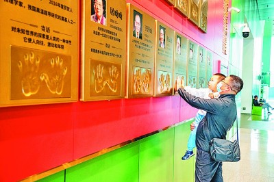上下圖均為觀眾在中國科技館參觀“國家最高科學(xué)技術(shù)獎獲獎科學(xué)家手模墻”。中國科技館供圖