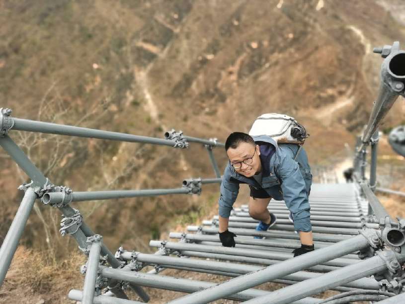 四川日?qǐng)?bào)記者侯沖攀爬鋼梯進(jìn)入“懸崖村”采訪途中