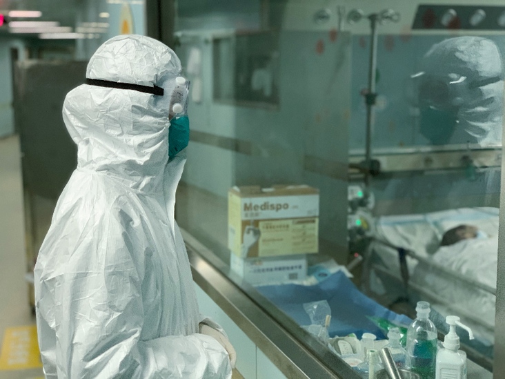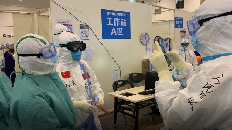 2月26日凌晨,人民日報記者吳姍在武漢市金銀潭醫(yī)院ICU重癥病區(qū)采訪。