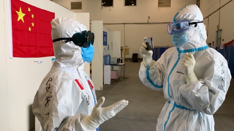 3月7日,武漢首批最大規(guī)模方艙醫(yī)院東西湖方艙醫(yī)院休艙現場,人民日報記者吳姍(右)見證最后一批轉院患者出艙。