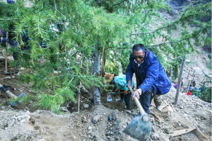 新冠肺炎疫情期間,巴拉格宗景區(qū)關(guān)閉,斯那定珠投入2000多萬購(gòu)置了4萬多棵樹苗,帶領(lǐng)200多個(gè)員工在景區(qū)植樹。 索朗農(nóng)布/攝