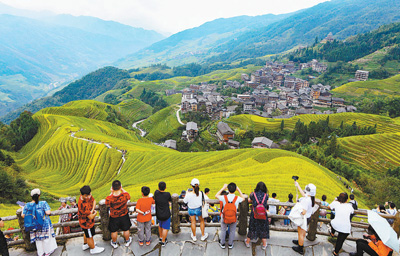 觀賞梯田秋色,體驗(yàn)民俗風(fēng)情,廣西桂林市龍勝各族自治縣龍脊梯田景區(qū)旅游持續(xù)火爆。圖為10月3日,游客在景區(qū)觀光游覽。吳生斌攝(影像中國(guó))