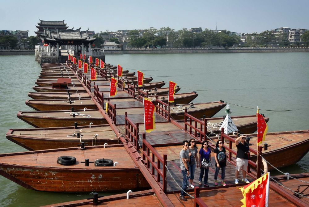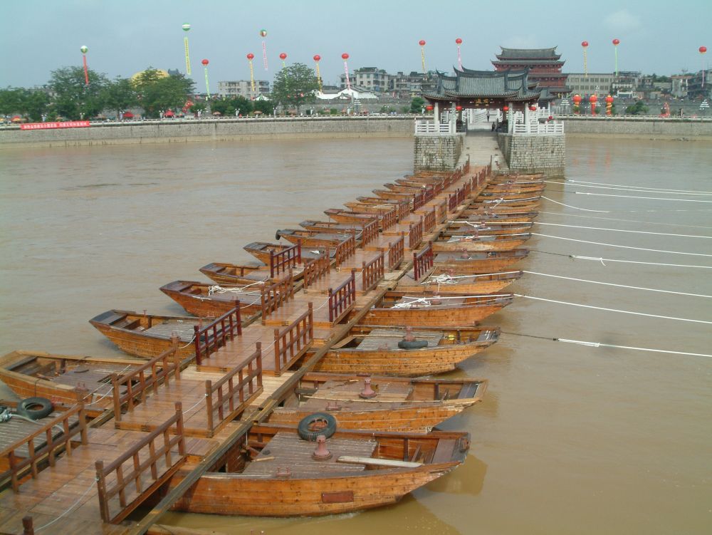 ↑ 廣濟(jì)橋中間的浮橋由十八只木船連接而成