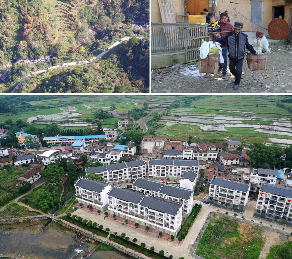 拼版照片的上左圖:在江西省修水縣上奉鎮(zhèn)麻洞村,村民胡尚海一家和鄰居們?cè)诔塑嚢犭x大山溝(2017年11月攝,資料照片)。