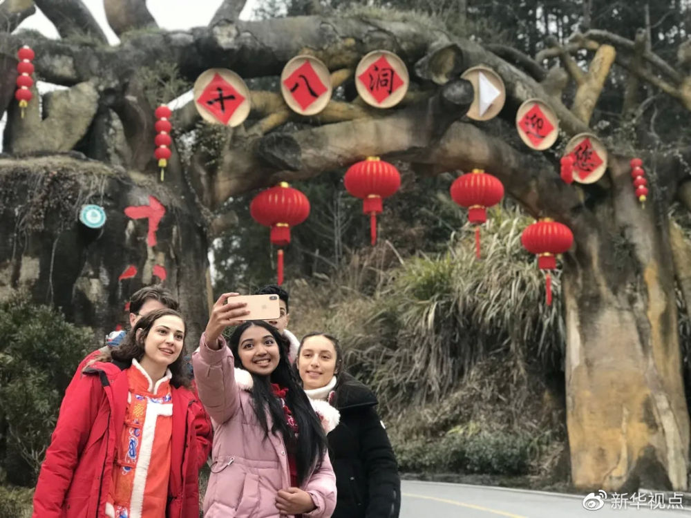 1月18日,多位外國(guó)友人受邀來(lái)到湘西十八洞村參加十八洞村的小年“村晚”,他們?cè)谑硕创蹇诤嫌?新華社記者張玉潔 攝