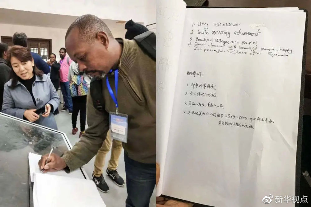 2019年10月28日,記者在十八洞村遇到了格林納達(dá)減貧戰(zhàn)略研修班的學(xué)員們,他們大多是來(lái)自格林納達(dá)農(nóng)業(yè)部的官員。參觀完后,他們派出代表在十八洞村留言簿上寫(xiě)下留言 新華社記者張玉潔 攝