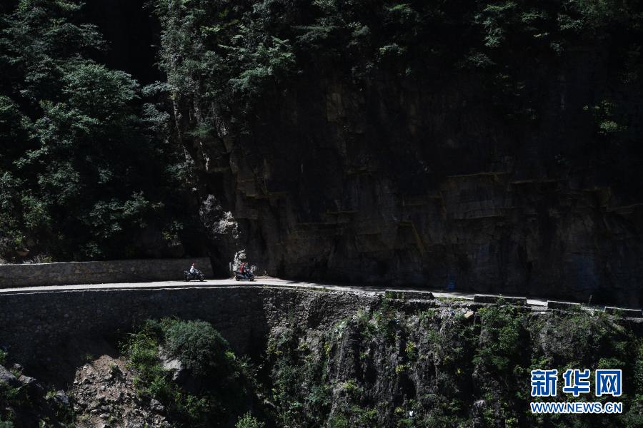 兩名下莊村村民騎著摩托車行駛在下莊村通往外界的公路上(2017年6月7日攝)。