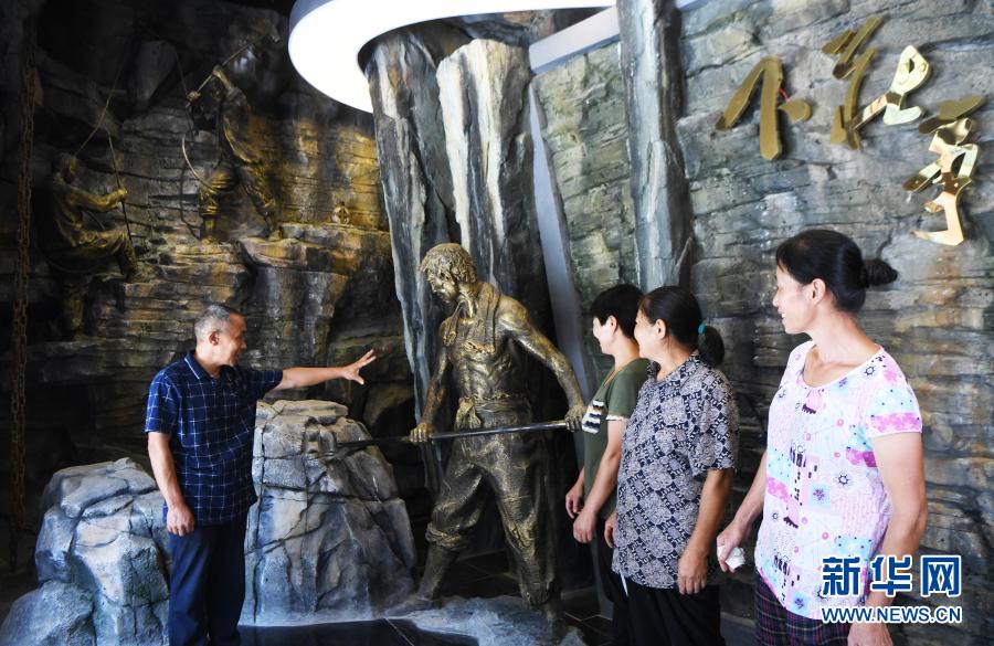 毛相林(右一)在下莊精神陳列館內(nèi)講述當年修路的故事(2020年7月3日攝)。