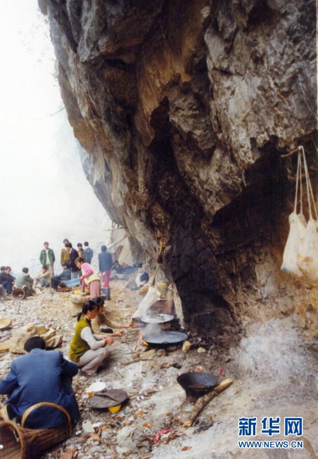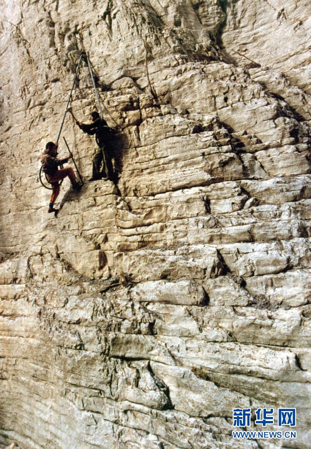 修路遠比想象的難。四周陡峭巖壁,很難找到落腳之地,膽子大的腰系長繩站在籮筐里,吊在幾百米高的懸崖邊鉆炮眼,先炸出一小塊立足之地,再用鋤頭、鋼釬和大錘,一塊一塊把石頭鑿下來。