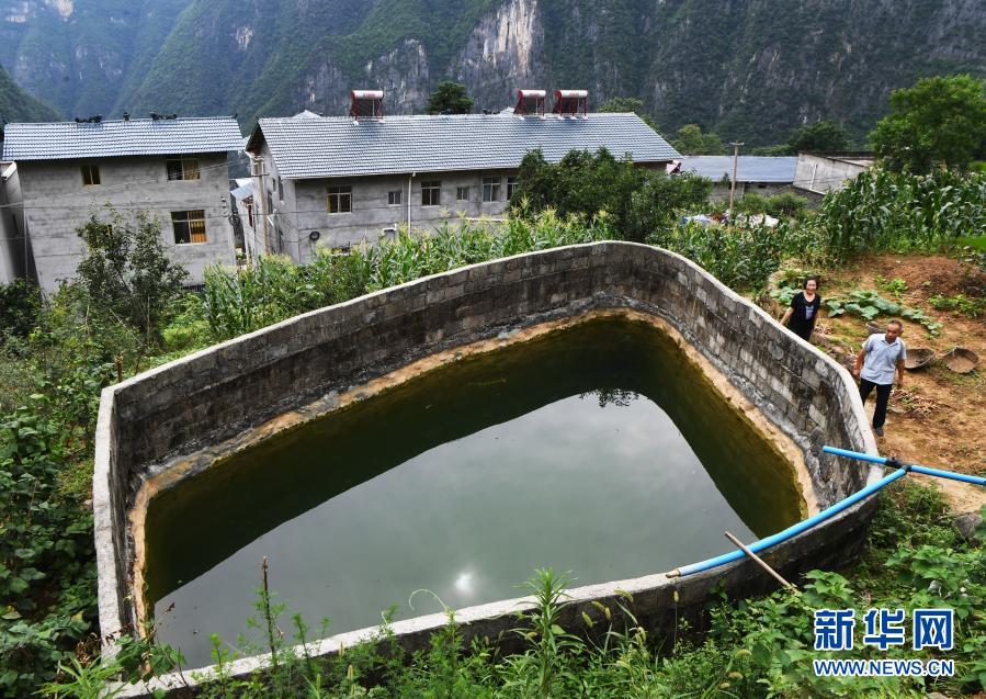 毛相林(前)經(jīng)過下莊村用于農(nóng)業(yè)生產(chǎn)的水池(2020年7月3日攝)。