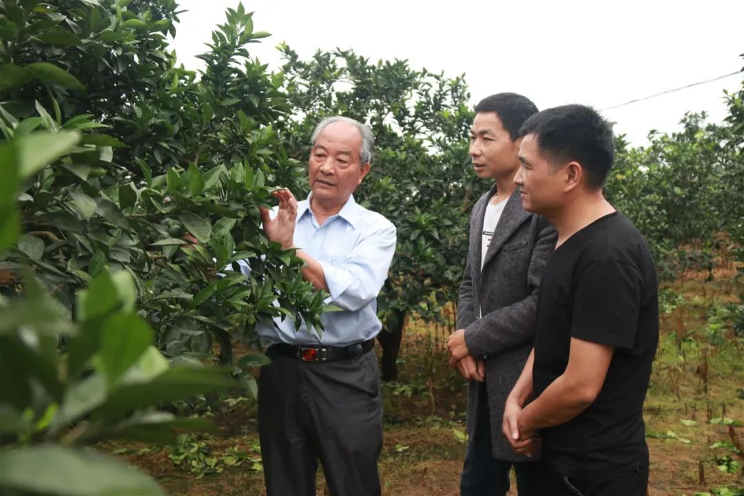 2020年5月23日,贛州市信豐縣大塘長崗村的客鄉(xiāng)橙園里,“贛南臍橙引種第一人”袁守根(左)在傳授臍橙種植技術(shù) 劉青 攝