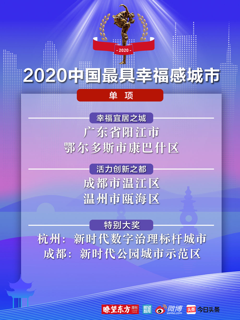 溫州、徐州、銅川、臺州、泰州、珠海、佛山、 威海、無錫、營口十座城市被推選為“2020中國最具幸福感城市”(地級市)。