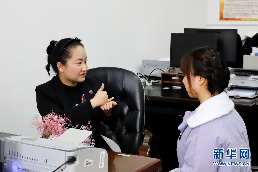 11月18日,在黑龍江綏化學(xué)院,李澤卉(左)用手語和學(xué)生交流。新華社發(fā)(黃龍斌 攝)