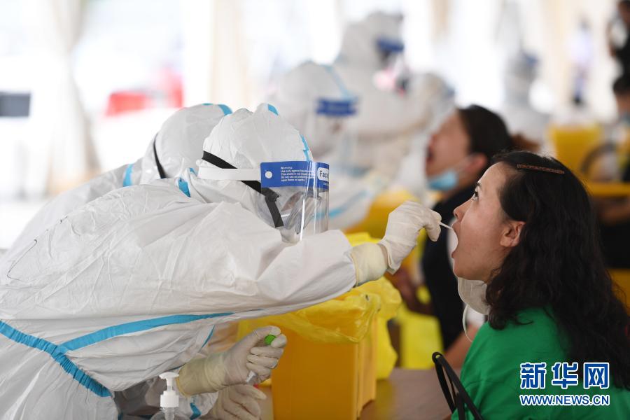 醫(yī)護(hù)人員在大連市人民路小學(xué)核酸檢測采樣點(diǎn)為市民采集咽拭子(7月27日攝)。新華社記者 龍雷 攝