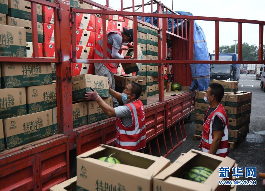 北京新發(fā)地農(nóng)產(chǎn)品批發(fā)市場主市場鐵路以南區(qū)域復(fù)市對外開放營業(yè),商戶在新發(fā)地農(nóng)產(chǎn)品批發(fā)市場內(nèi)卸下將要售賣的水果(8月15日攝)。新華社記者 張晨霖 攝