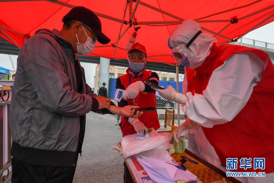 在吉林省舒蘭市弘林家園防疫卡點(diǎn),青年志愿者為居民測溫登記(5月14日攝)。新華社記者 張楠 攝