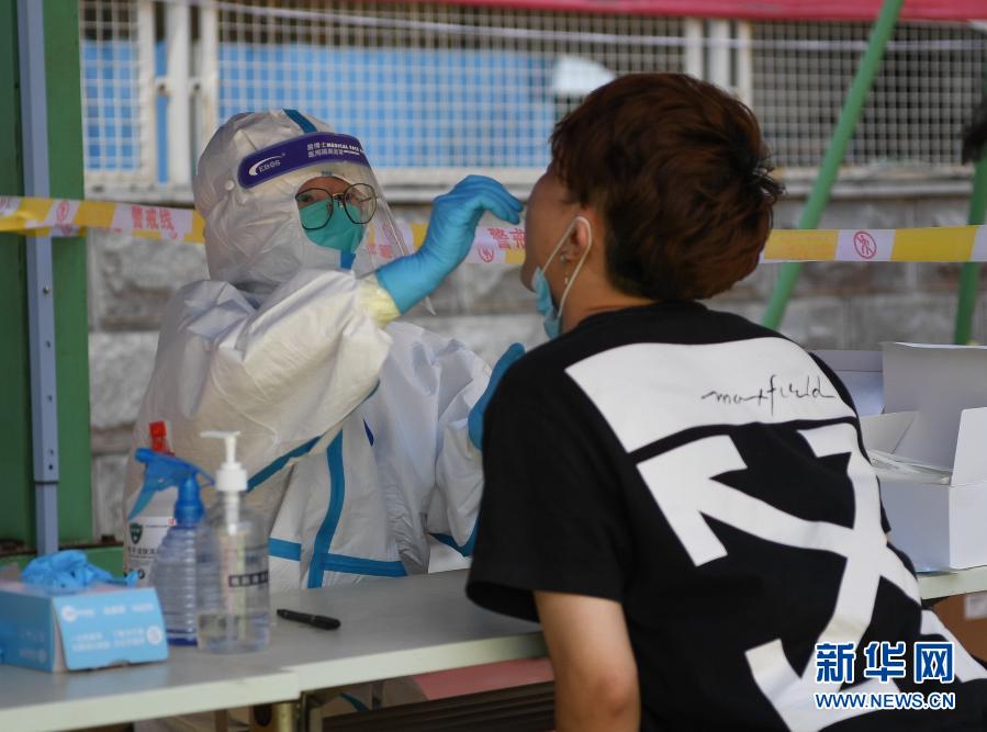 在北京市西城區(qū)北京展覽館南側(cè)的露天廣場核酸檢測采樣點(diǎn),醫(yī)護(hù)人員為前來做檢測的人員進(jìn)行采樣(6月28日攝)。新華社記者 鞠煥宗 攝