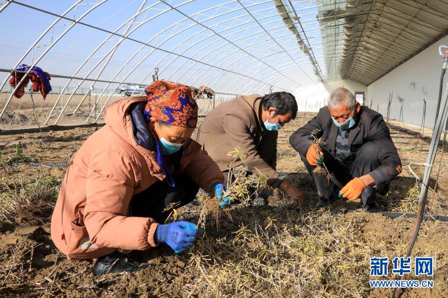 在新疆阿克蘇地區(qū)烏什縣阿合雅鎮(zhèn)吐曼村沙棘苗圃基地,員工在培育苗圃(11月7日攝)。新華社記者 張曼 攝
