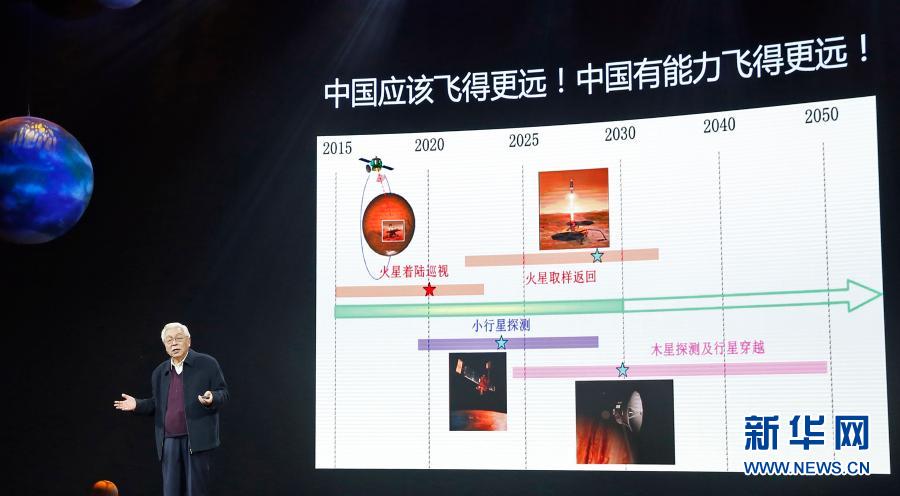 “這次嫦娥五號(hào)肩負(fù)著月球采樣返回的光榮使命,我們的天問一號(hào)也正在飛向火星的路上,我們還要飛得更遠(yuǎn),去探測(cè)木星、小行星并建設(shè)我們的國(guó)際月球科研站。中國(guó)已經(jīng)昂首進(jìn)入了深空探測(cè)的新時(shí)代?!睔W陽自遠(yuǎn)說。