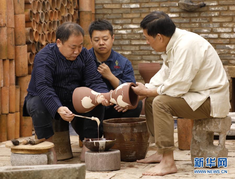 平頂山學(xué)院陶瓷學(xué)院院長(zhǎng)梅國(guó)建(右一)指導(dǎo)徒弟為花瓷腰鼓施斑釉(資料照片)。新華社發(fā)