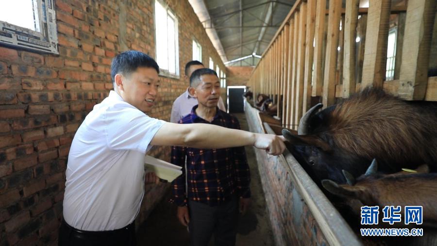 全國勞動模范、四川省南江五郎黃羊養(yǎng)殖專業(yè)合作社理事長汪其德(左一)在巴中市南江縣紅旗村村民家中指導(dǎo)養(yǎng)羊技術(shù)(資料照片)。新華社發(fā)